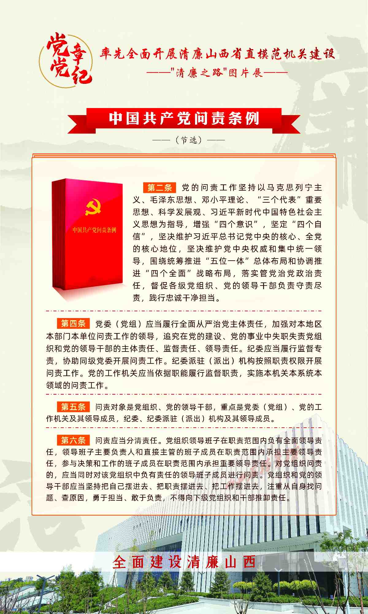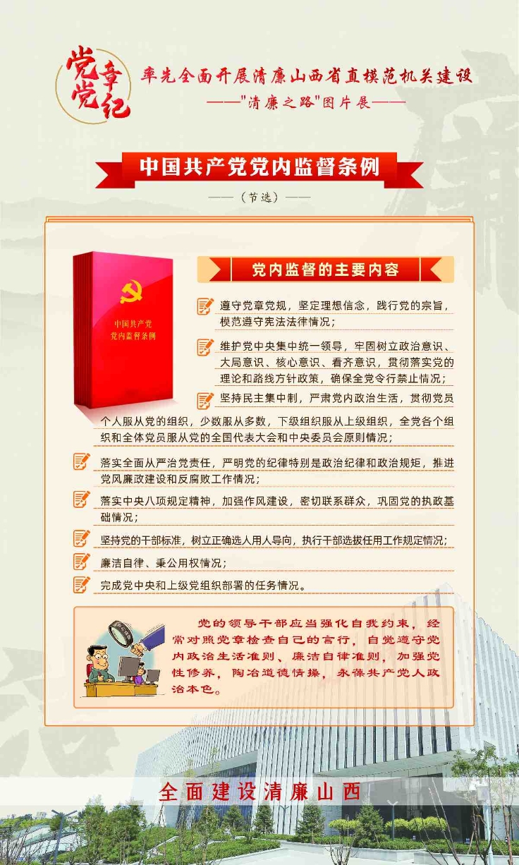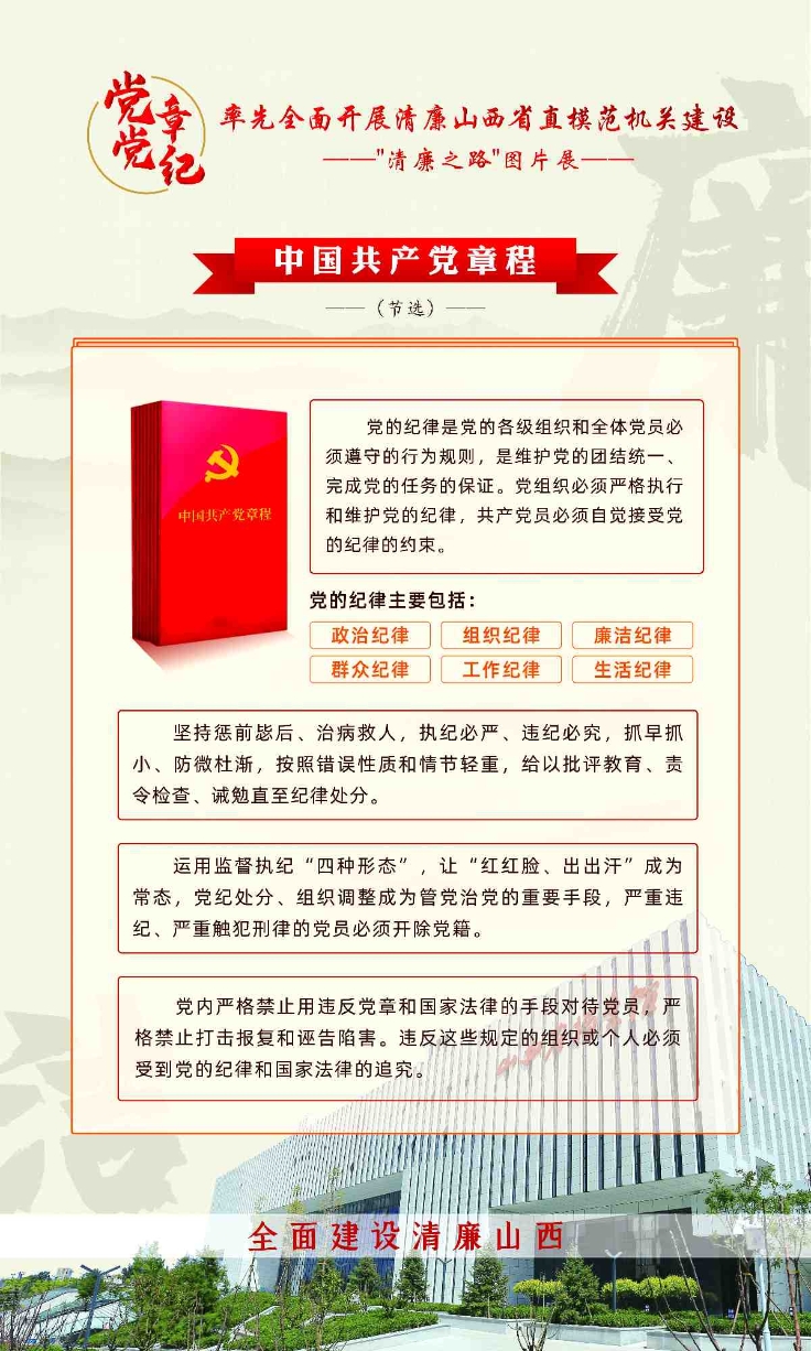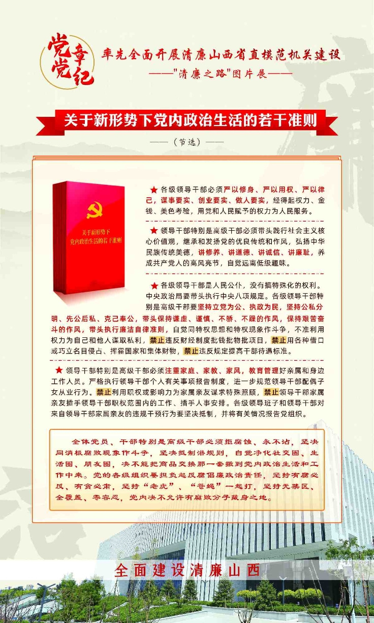 节选《中国共产党章程》、《中国共产党廉洁自律准则》、《关于新形势下党内政治生活的若干准则》、等党章党纪中关于“从严治党”“清正廉洁”的相关规定,树牢党章党规党纪意识,坚定不移推进全面从严治党。